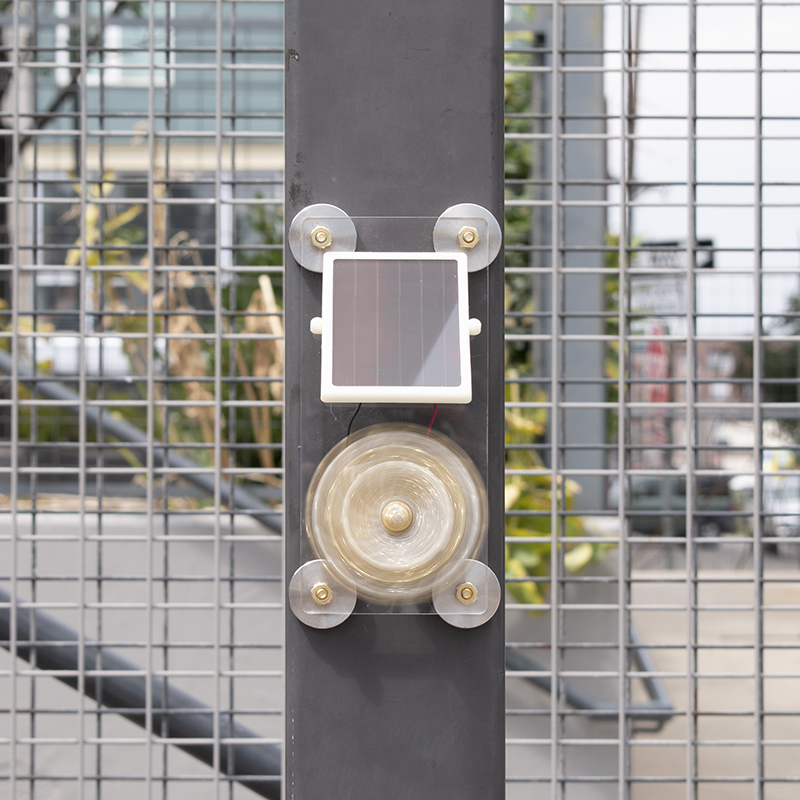 Pinwheel, 2021, found ornament, solar powered motor, magnets, acrylic sheet, attachments.