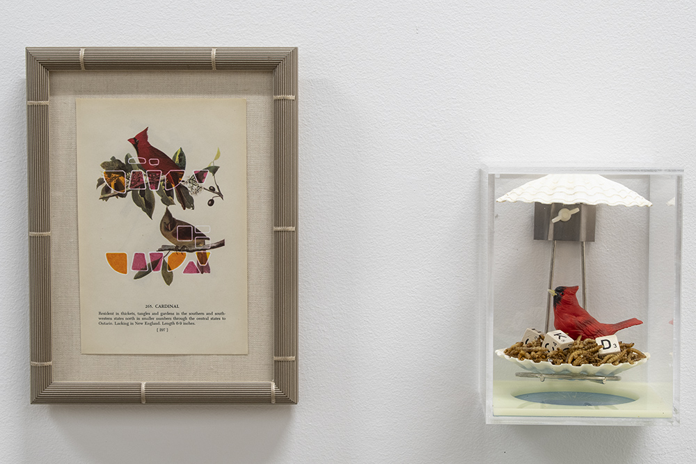 Cardinals with Augur’s Feeder, 2022, bird guide page, ink, watercolor; ceramic bird, game blocks, dried meal worms, seashells, acrylic sheet, laser print on transparency, wire rack, steel plate, ball bearings, attachments.